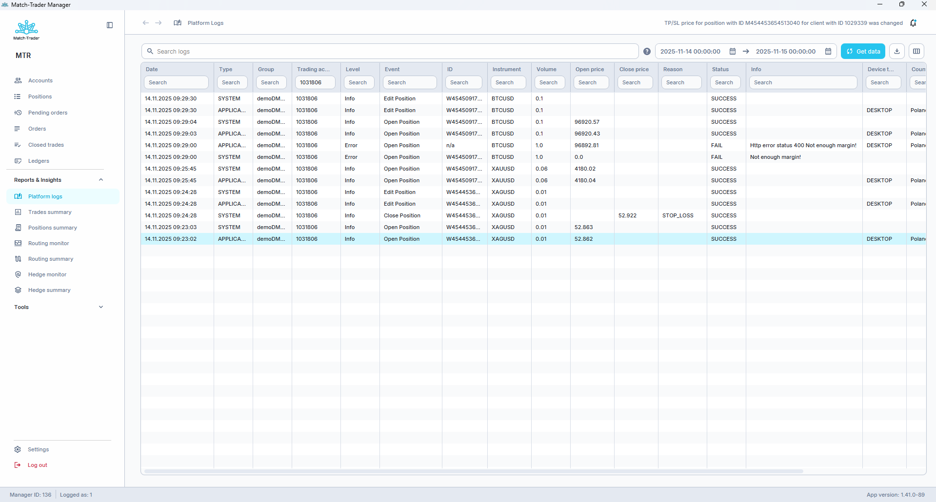 Manager 2.0’s Platform Logs tab now delivers detailed records of critical trading and account operations directly to brokers. They can track logs for actions such as opening, editing, and closing positions, partial closes, creating and managing pending orders, as well as user sign-ins and sign-outs. Each log entry is packed with context – device type, browser identifiers, IP addresses, and group associations. This equals no more relying on external systems for investigations. Brokers can quickly investigate user activity, identify suspicious behavior, and resolve disputes, all within the same system. By surfacing granular operational data, the solution empowers users to proactively detect potential fraud or abuse and ensure regulatory compliance.