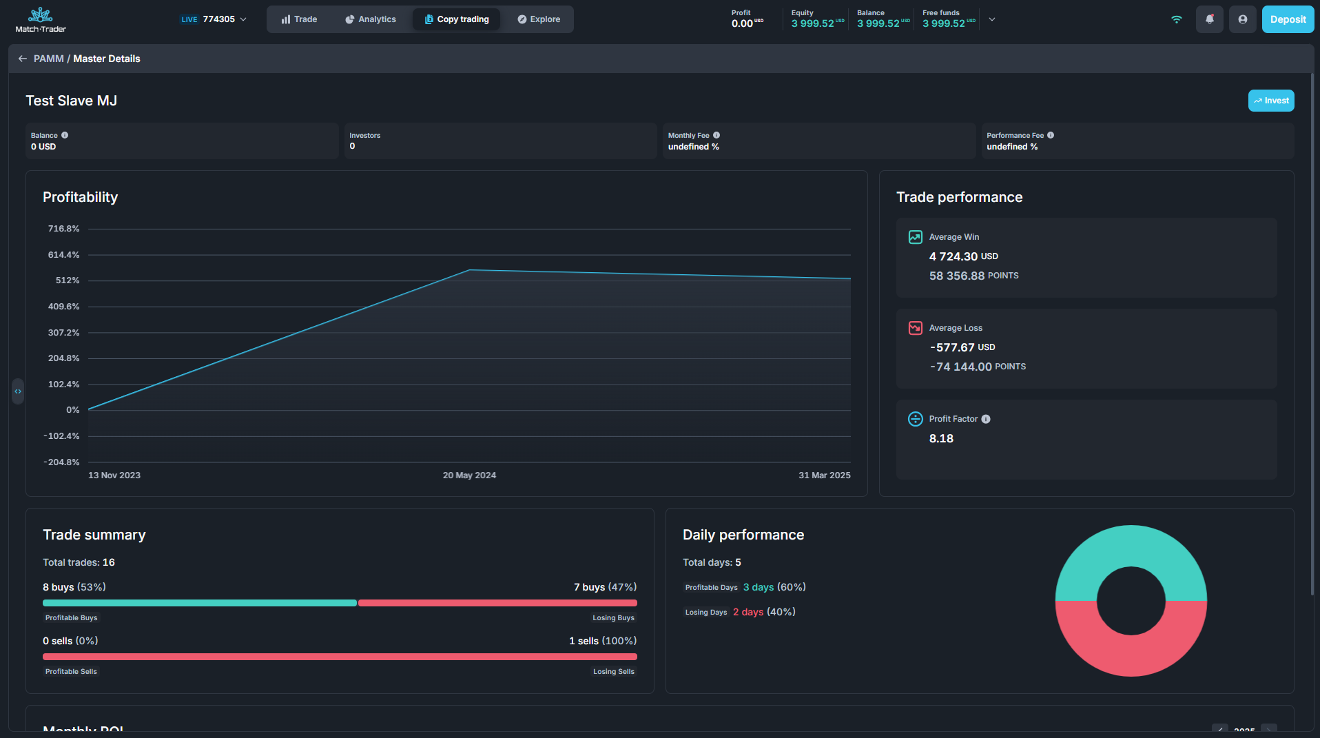 The PAMM module (Percent Allocation Management Module) has been redesigned for the Match-Trader platform, delivering a completely modernized yet familiar user experience within our Social Trading suite. While sporting a sleek, contemporary look, it preserves all existing functionality from the legacy system. All essential tabs and features for production-ready PAMM operations are fully implemented, with exhaustive cross-platform testing ensuring a flawless user transition and strong performance across various resolutions and mobile devices.