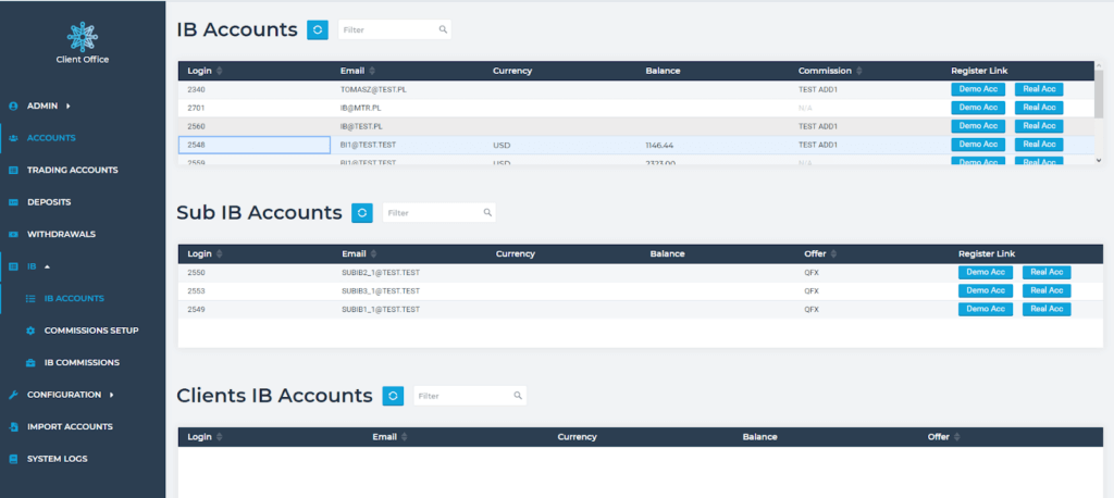 We have also added support for multi-level commission structures (up to 4 levels) with automatic generation of referral links. Each IB has its own access to the IB portal. It’s where all clients and commissions generated by their clients are visible. Customers can now make internal transfers between different accounts on the platform.