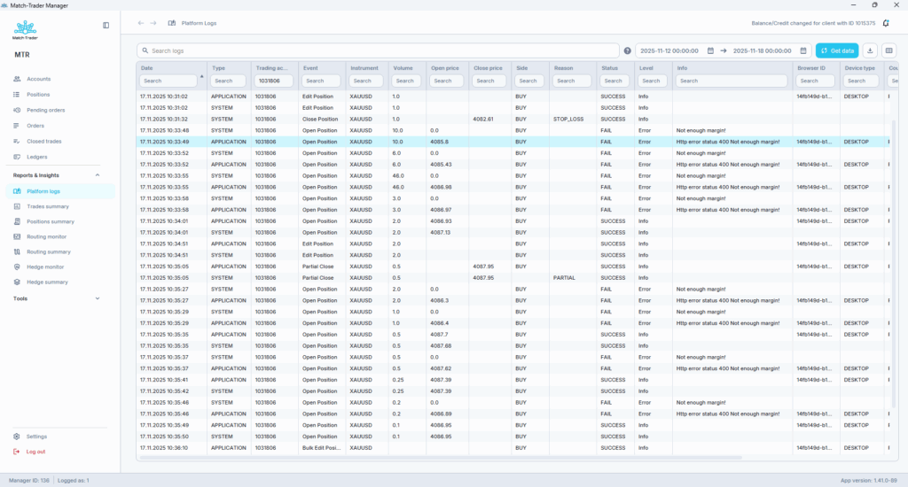 The Platform Logs tab in Manager 2.0 now provides brokers with direct access to detailed records of key trading and account operations. Brokers can review logs for actions such as opening, editing, and closing positions, partial closes, creating and managing pending orders, as well as user sign-ins and sign-outs. Each log entry includes valuable contextual information such as whether the action was performed via mobile or web, browser identifiers, IP addresses, and group associations. This comprehensive visibility enables brokers to quickly investigate user activity, identify suspicious behavior, and resolve disputes without relying on external systems. By surfacing granular operational data, the solution empowers brokers to proactively detect potential fraud or abuse and ensure regulatory compliance.