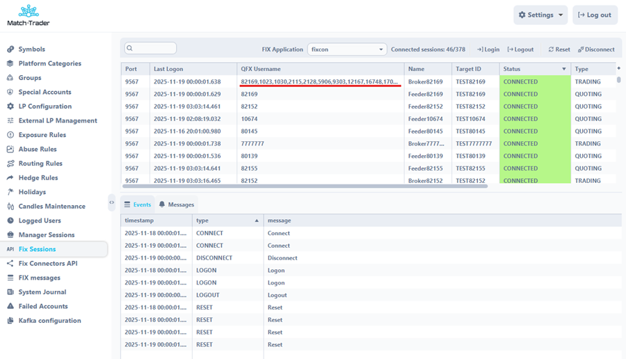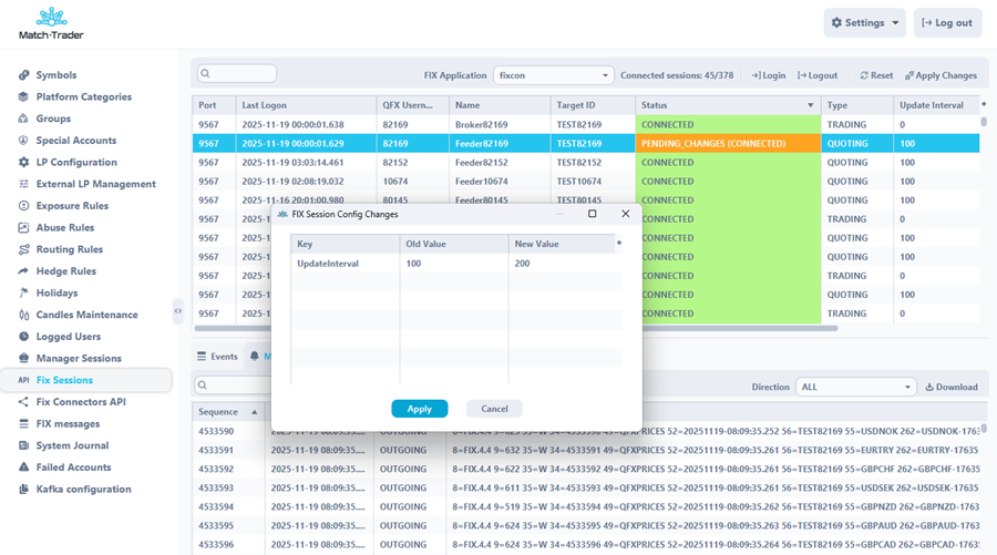 • Fewer technical bottlenecks – all FIX sessions are managed directly in Match-Trader Admin with real-time status, a live FIX message view, and one-click restarts and configuration adjustments