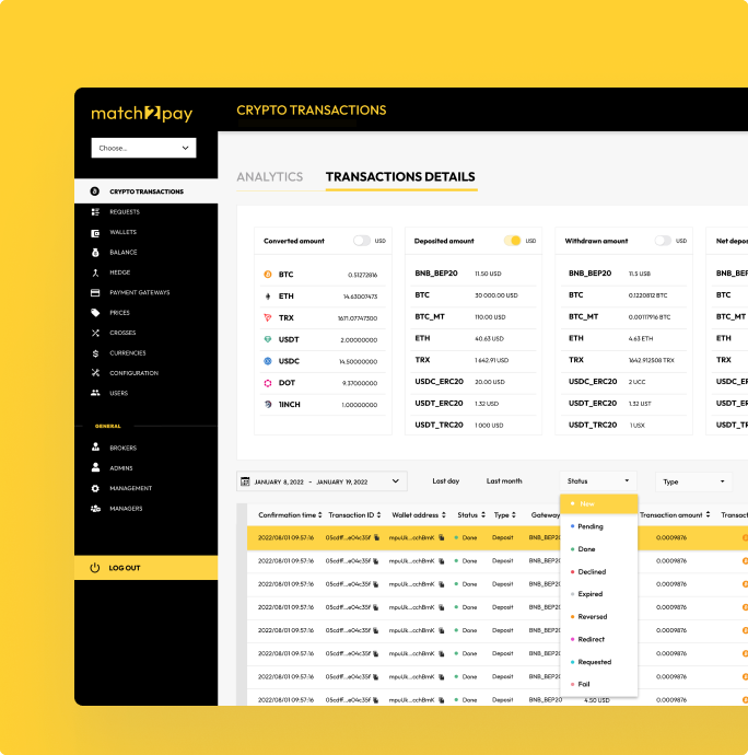 Yes, when using our Match2Pay Standard solution, you can set up everything in a way that we will convert all volatile crypto currencies for you to the balances in USD, EUR or any other major currency. This will not only help you to avoid volatility risk, but our processor will also provide your CRM with the exact exchange rate to book on the client’s account. What is also unique about our solution is that we convert stable coins with USD 1:1, which makes it even simpler to use by the merchants focused predominantly on USD deposits used worldwide.
