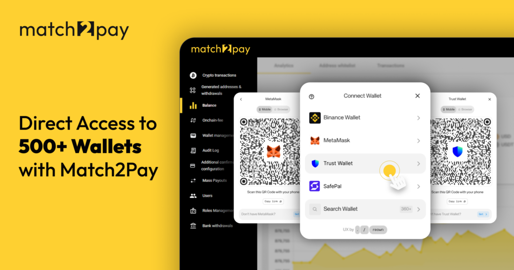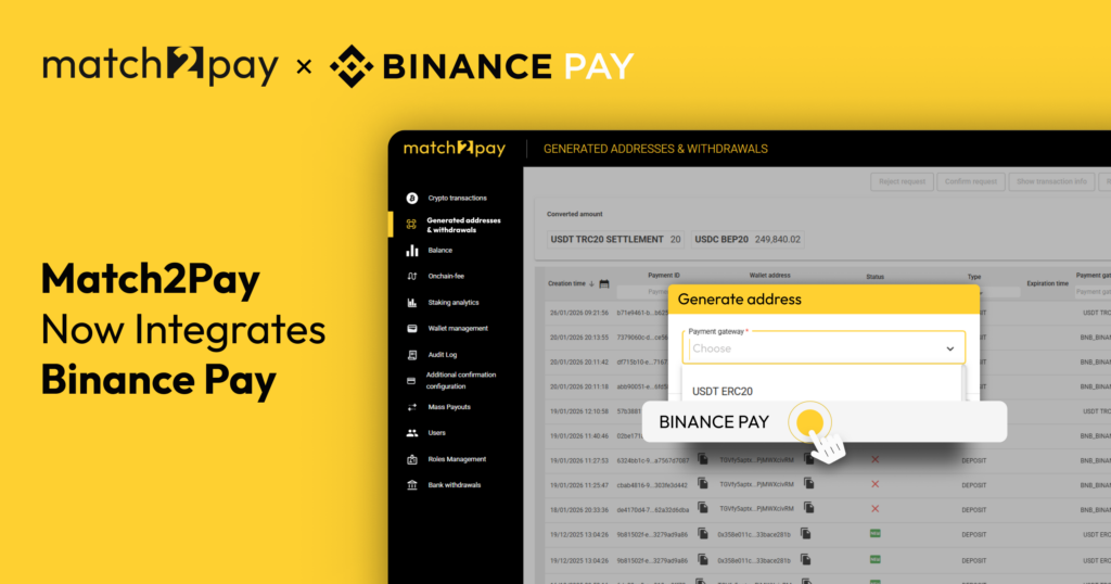 The services offered by Match2Pay were built based on the technological solutions delivered by the strategic partner – Match-Trade Technologies, which has been developing the crypto payment gateway since 2018. With its expertise in the fintech industry, Match2Pay has grown to being a leading crypto payment processor tailored specifically to meet the unique needs of businesses in this sector. Thanks to our partnerships with many financial institutions we can also offer you a crypto business wallet where you can freely exchange your fiat currency to crypto, and send out payments to the third-parties enterprises in crypto.