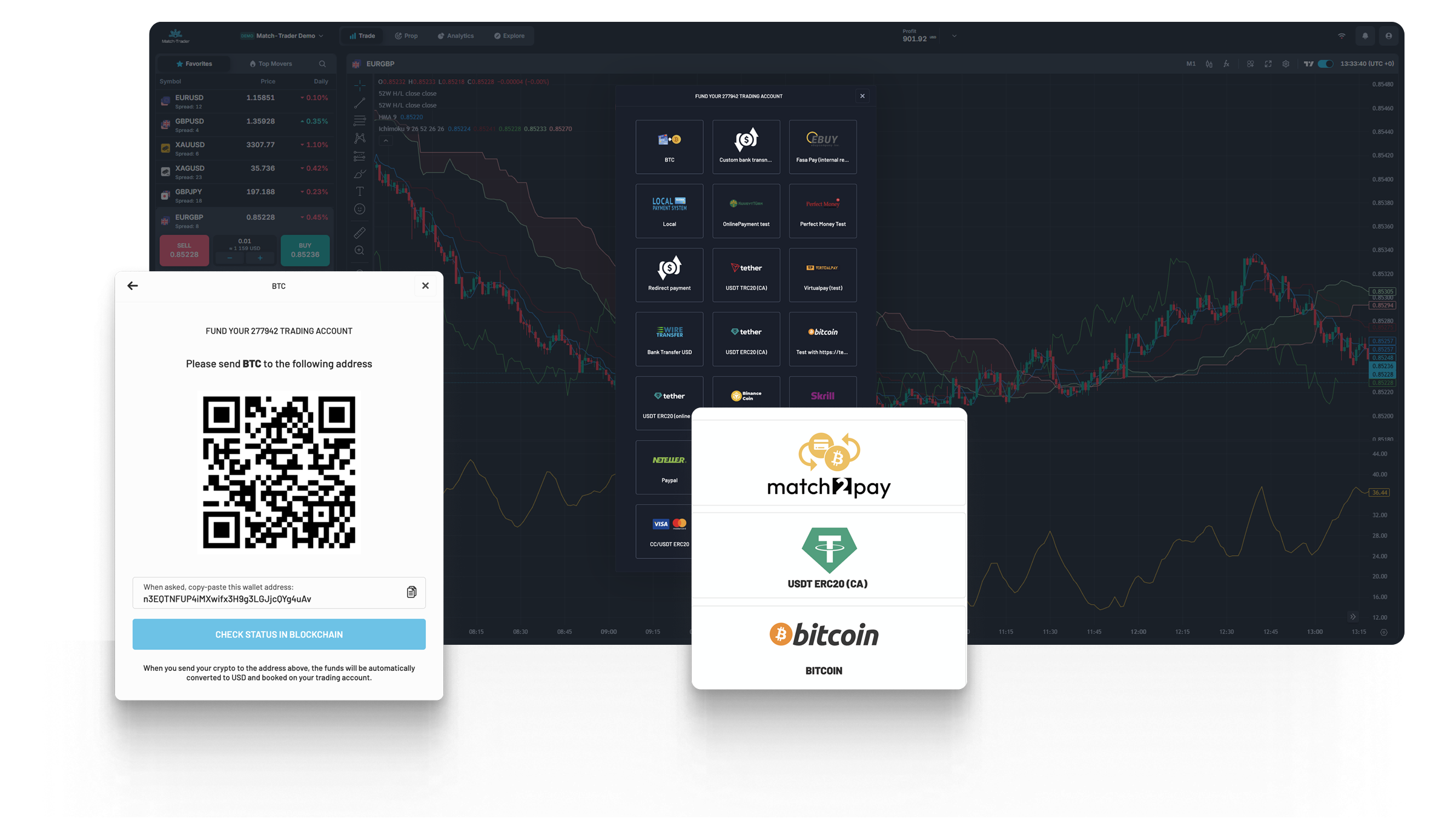 Moreover, the Match2Pay crypto payment gateway is also part of the ecosystem of the Match-Trader trading platform, developed by the same technology provider for CFD Brokers, Match-Trade Technologies. This seamless integration allows Brokers to benefit from instant deposits, among other things.