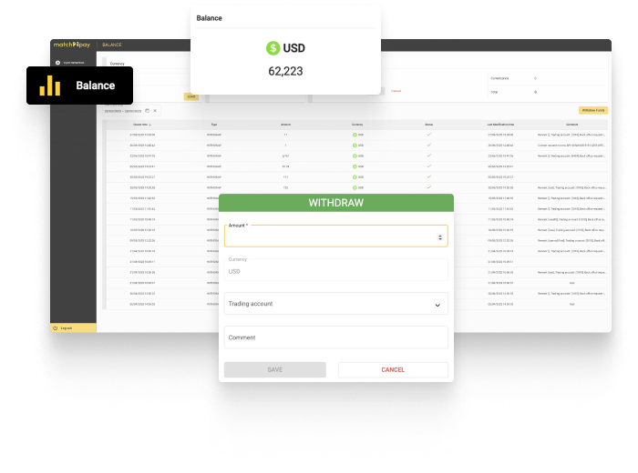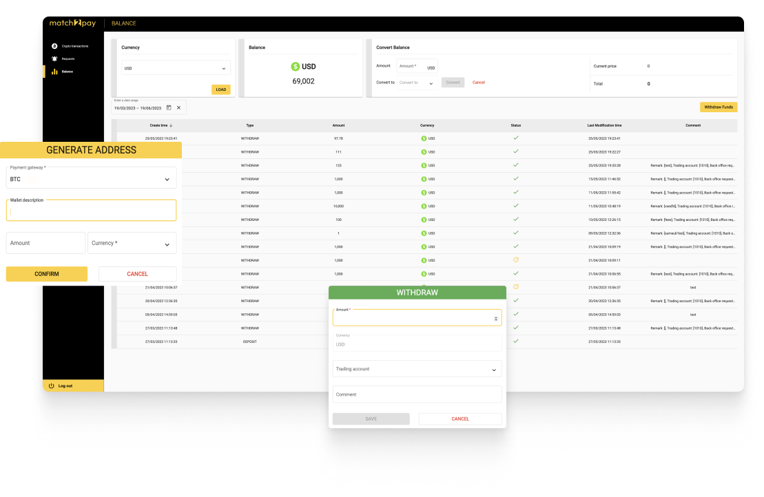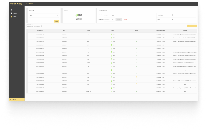In the Balance tab, merchants using Match2Pay for crypto transactions can easily check the available balance for a specific currency from the drop-down list, convert funds, and request withdrawals.