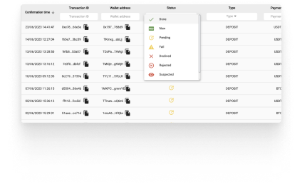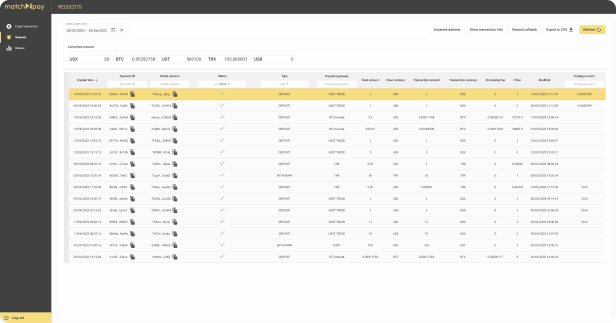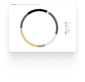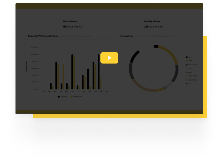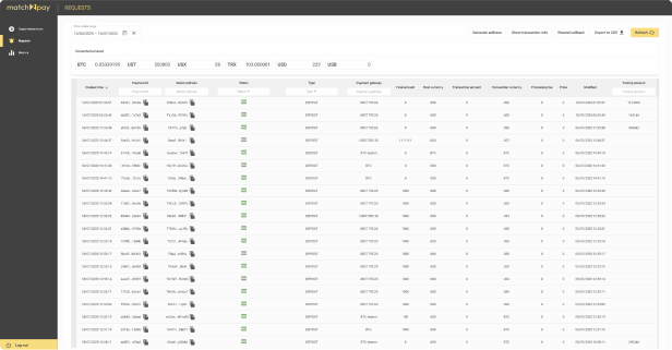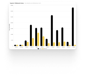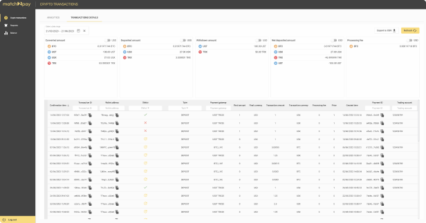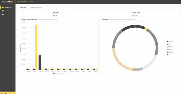 Our built in analytics module shows statistics with deposits / withdrawals volume their clients made in chosen currency and the number of transactions per different crypto network. There is also a option to export the full transaction report with statistics to cvs file.