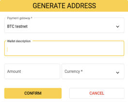 This button allows Match2Pay users to generate a new cryptocurrency wallet to  deposit funds to. You can choose the payment gateway, amount, currency and give a description to a new wallet.