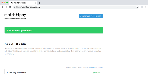 Our status page provides real-time insights into system stability, allowing all customers to monitor their transaction activities, ensuring a seamless and reliable experience as they track the service’s status.