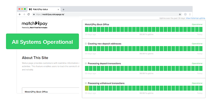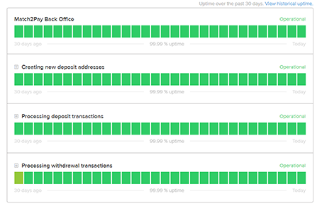 It demonstrates the robust stability of our Match2Pay, boasting an impressive 99% uptime over the past 30 days across diverse networks.